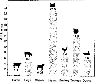 Animal agriculture in Indiana makes a significant contribution to the supply of meat, milk and eggs for consumption in our nation and abroad and supplies a considerable amount of revenue to the state. In 1988, sale of livestock and livestock products in Indiana equalled $1.74 billion. Lives- tock sales made up 42.5 percent of the $4.1 billion total of all agricultural commodities in the state (Figure 1).