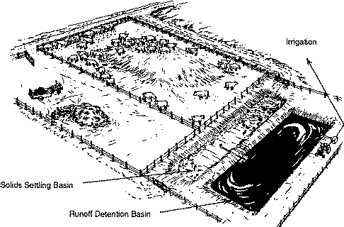 Contaminated runoff should be absorbed in a grassed filter channel or collected in a holding pond. A settling basin must be placed between the feedlot and filter channel to remove 60-75 percent of the manure solids (Fig- ure 2). Removing solid waste helps reduce odors from holding ponds and allows easy removal of the waste water by irrigation equipment. The feedlot size, number of animals and soil type, determines if a filter channel and holding pond can be used. The runoff collected in the holding pond will be applied to fields by irrigation.