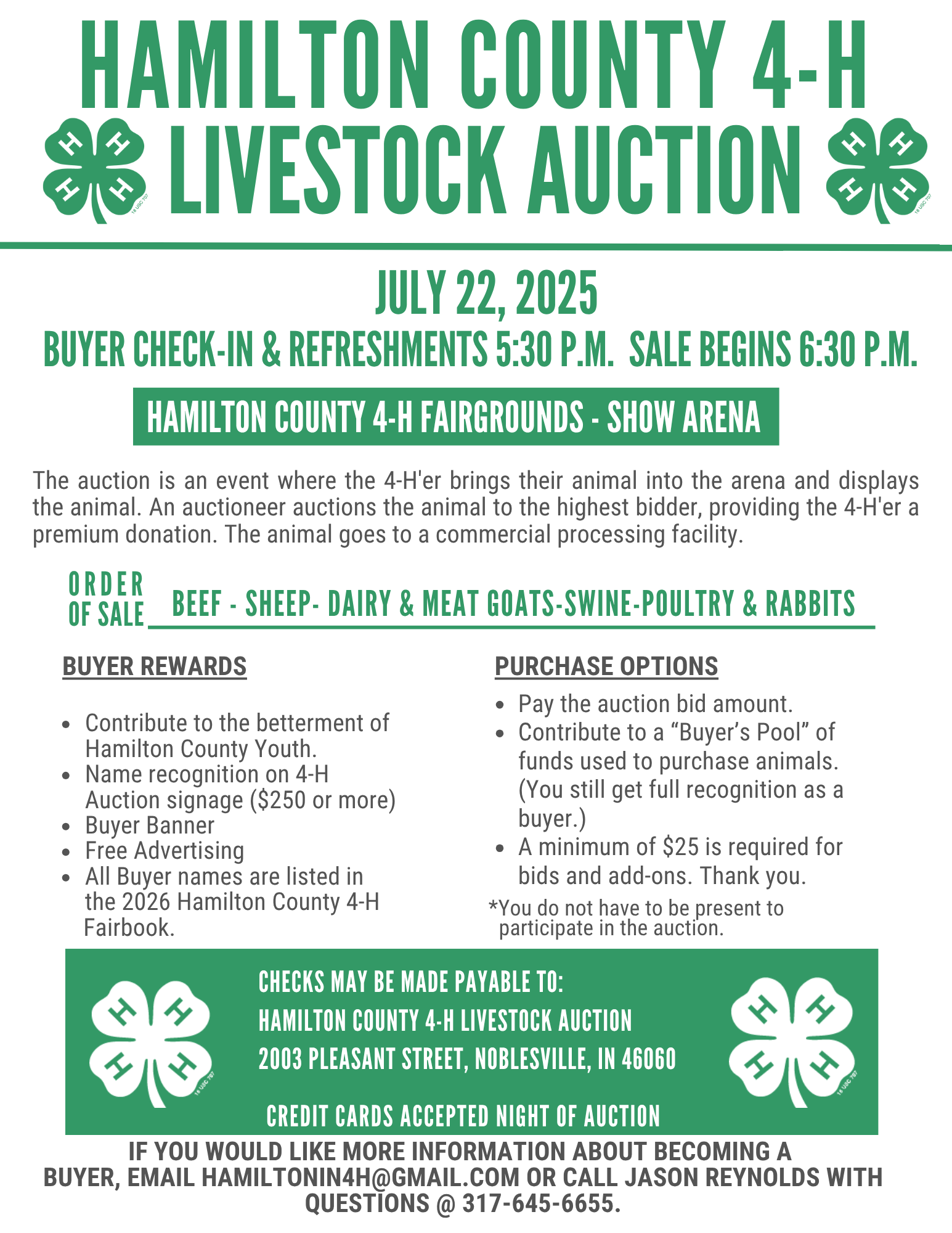 The Hamilton County 4-H Fair & Livestock Auction will soon be here! 4-H'ers can contact potential buyers at any time to suggest they bid on animals at the 4-H Auction.