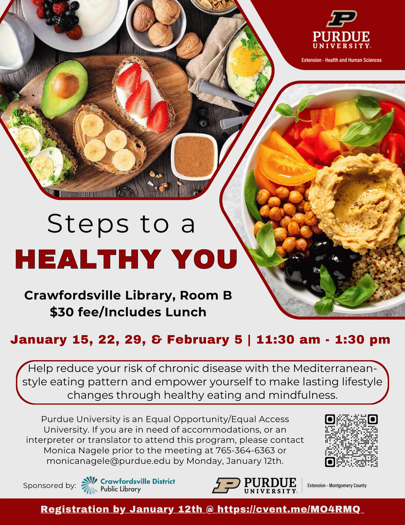 Join Purdue Extension and Register Dietitian Monica Nagele at the Crawfordsville District Public Library, Room B, on January 15, 22, 29, and February 5 from 11:30 a.m. to 1:30 p.m. Your $30 registration includes lunch each week, plus hands-on food demonstrations and cooking instruction that make learning both fun and delicious.