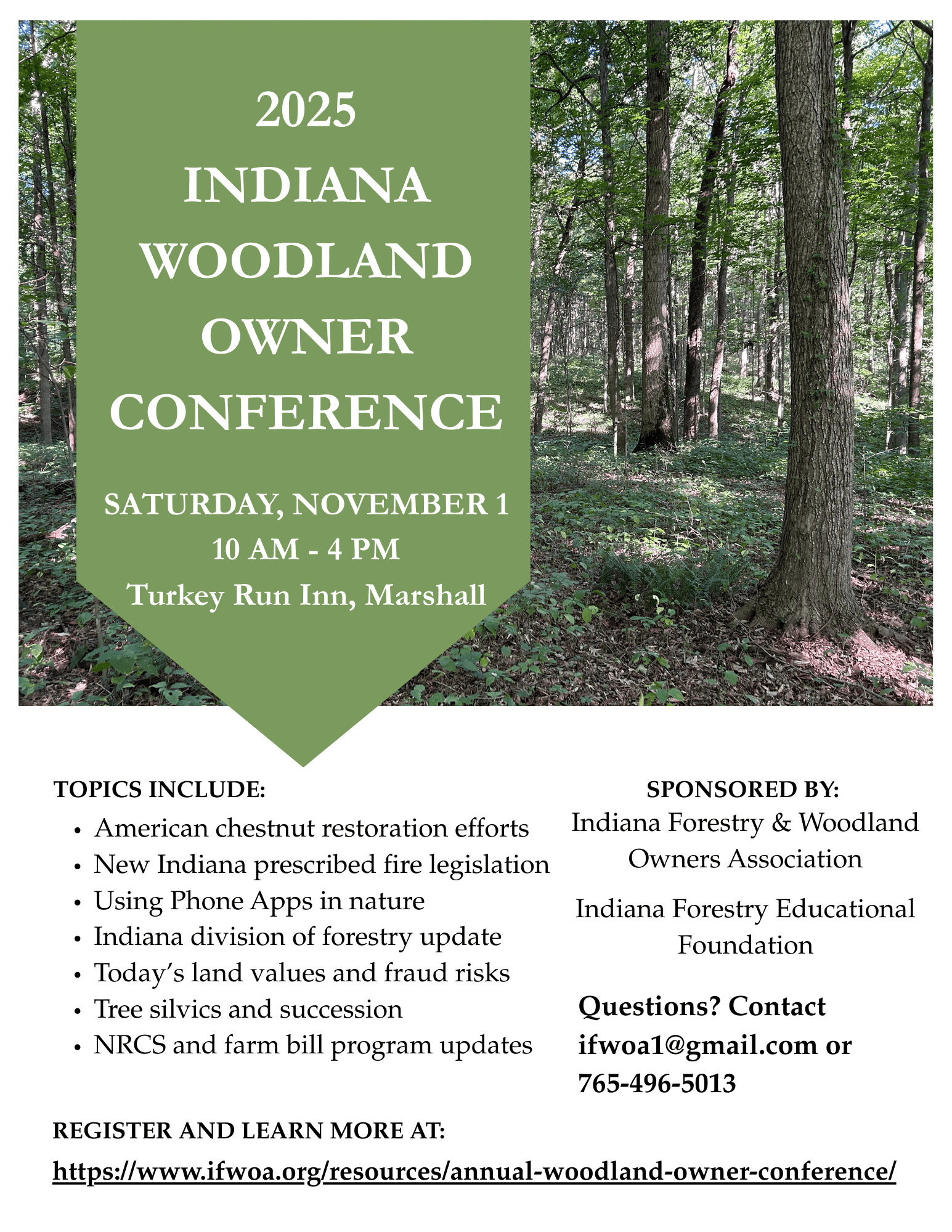 Hosted by the Indiana Forestry & Woodland Owners Association, the event is expected draw 150 landowners from across the state who come to improve their knowledge of forest management and network with other woodland owners.
