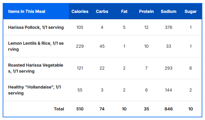 The harissa seasoned pollock will be paired with a side of lemon lentils with rice, some seasoned roasted vegetables, and some healthy hollandaise sauce. Overall, the dish tangy and protein packed making it a bright but filling option for dinner.