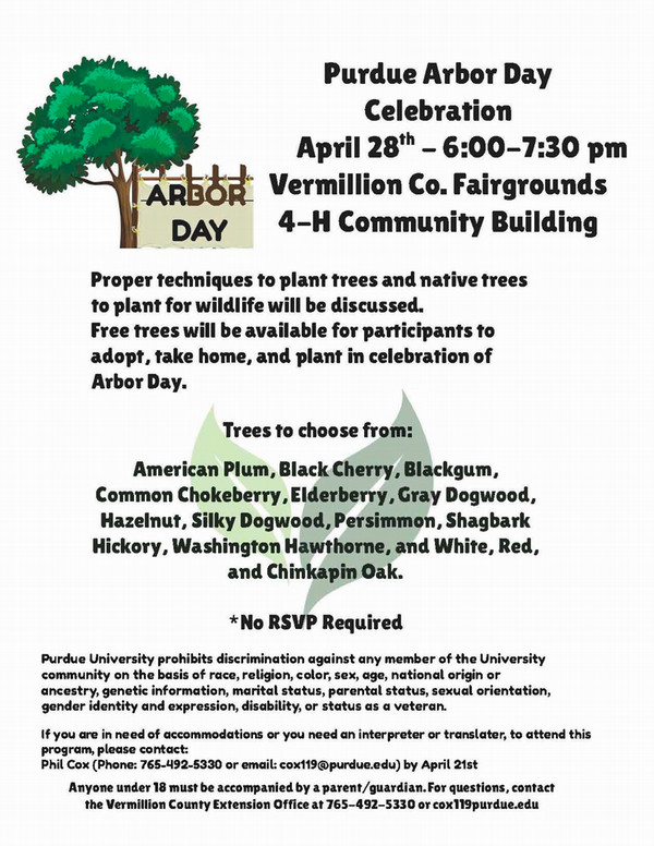 FREE Purdue Extension will host an Arbor Day Celebration at 6:00 – 7:30 pm, April 28th at the Vermillion Co. Fairgrounds’ 4-H Community Bldg. Proper techniques to plant trees and native trees to plant for wildlife will be discussed.