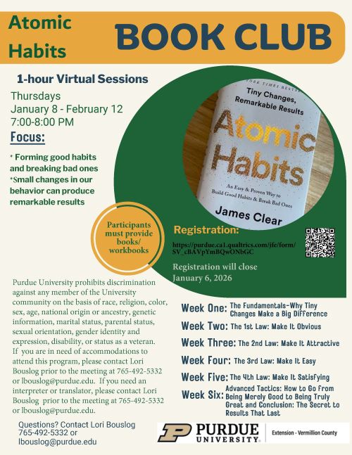 If you are in need of accommodations to attend this program, please contact Lori Bouslog prior to the meeting at 765-492-5332 or lbouslog@purdue.edu by January 06, 2026.