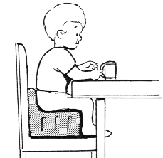 The child's chair should be even with the table. The child's feet should be resting on something. He should be able to reach his food.