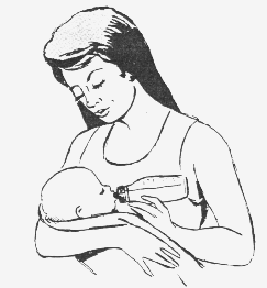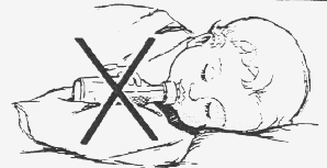 2.Hold your baby close for feeding. Do not set up the bottle for the baby to drink alone. This may cause ear aches, choking, and "nursing bottle mouth" (rotten teeth). This is because the baby can fall asleep with formula or juice in the mouth. Also, the baby misses out on hugs and being close to you.