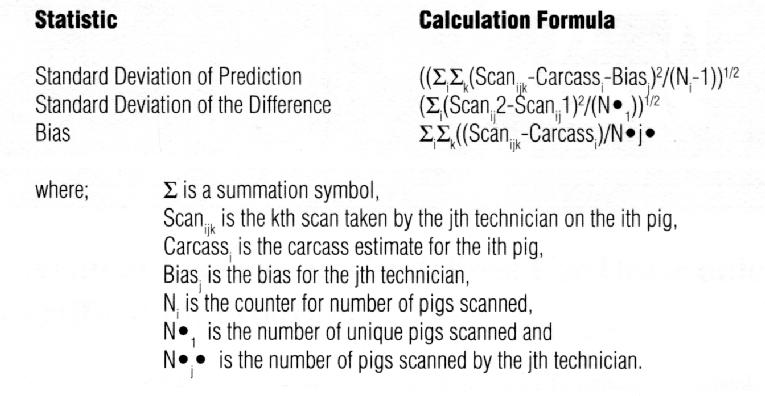 The statistics used to quantify prediction of carcass measurements and repeatability of ultrasonic measurement are the Standard Deviations of Prediction, Standard Deviations of the Difference and Bias which is the average miss of live and carcass (Certified Technician) measurements. The standards for these statistics will be: