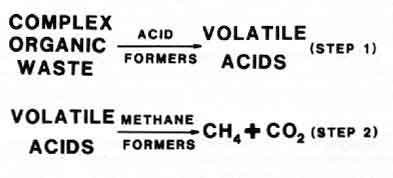 Methane generation requires two main groups of anaerobic bacteria-the `acid formers', which convert waste to organic acids; and the `methane formers', which then convert these organic acids to methane and carbon dioxide (Figure 1). Also, there are two distinct temperature ranges in which these bacteria can produce significant amounts of methane gas-the mesophillic range (90-110F)and the thermophillic range (120-140F). Recent research using thermophillic bacteria shows some promise and will be discussed briefly later; however, this publication deals mainly with conventional digestion units operated in the mesophillic range.