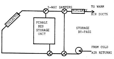 Figure 16 shows a typical layout of a solar heating system which uses concrete block as the storage material. In this design, the block has been added as a false wall on the outside of the existing wall. A rock bed storage could also be used as in the house example.