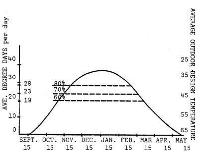 In designing the system the average temperature for the day, not including night-time temperatures, should be used. At Indianapolis this temperature is 33°F in December. The number of degree days for this typical day would be 65°-33° = 33 degree days.