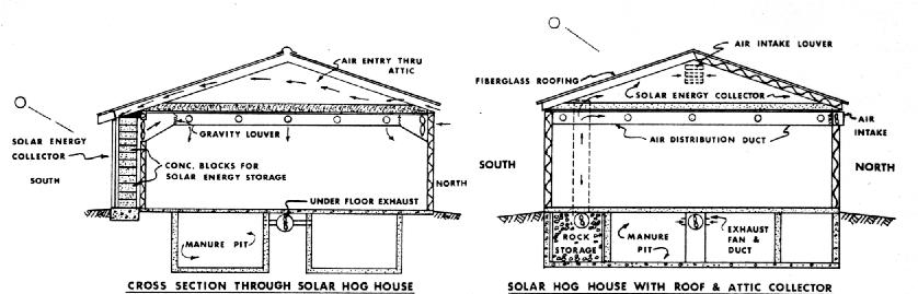 Farrowing houses, calf barns, poultry houses, and finishing barns have been heated with solar energy. Both covered-plate and bare-plate types of collectors have been used to heat the air for ventilation of these buildings. The bare plate type generally consists of a metal roof painted black over en air duct. The covered plate type uses fiberglass or plastic as the cover plate.