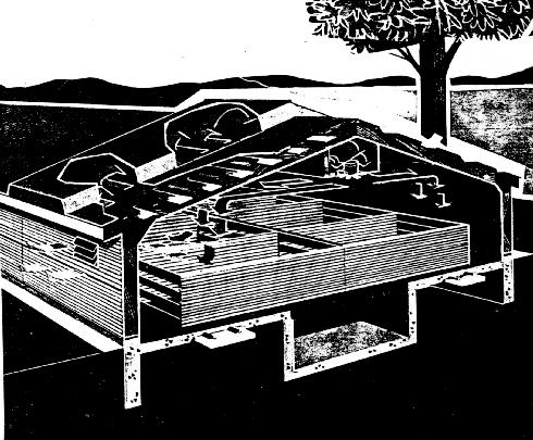 Of course, a system may be designed without storage. In such a system the losses per hour would be found for the daytime temperature as before and the heat produced by the stock (BTU/hr) would be subtracted from this. The sizing procedure would be the same as in the house example. Again, 10 to 15% of the heat requirements with an absolute maximum of 20% is about all you can expect to provide without storage. One such system is shown in Figure 17. Air is pulled in at the gable ends of the roof and is warmed by solar energy as it passes through the collector ducts. The warm air is pulled to a central distribution duct by fans and forced down into the building. It is exhausted through gravity type shutters in the sidewalls. A supplemental heating system is used at might and during cloudy periods. For summer ventilation, the air flow is reversed and blown out through the roof in this design. Besides the heat from the sun, the air "picks up" some of the heat escaping from the ceiling, thereby recovering heat which would otherwise be lost.