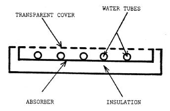 The basic water collector consists of an absorber plate, generally having water tubes attached, a cover, and insulation behind the absorber plate, as in Figure 3. Heat from the absorber plate is re-moved by the water circulating in the tubes.