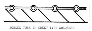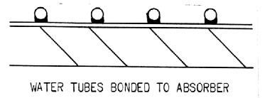 Materials generally used for collector plates are copper, aluminum, and steel. Copper is the most expensive, but also has the highest thermal conductivity. Steel is the least expensive and also has the lowest conductivity of the three. For water-heating collectors, especially, the conductivity is important. For copper, the water tubes (which are bonded to the absorber plate -- see Figure 4) may be spaced further apart than for a material of less conductivity. Another important consideration is the bond of the water tubes to the plate. The soldering connection must be good or efficiency will suffer. Such bonding presents more of a problem with aluminum. Some plates use bonded tube-in sheet design like many refrigerator shelves used to be (see Figure 5), which provides good thermal contact.