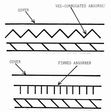 If the entire area of the absorber is swept by the transfer fluid, the conductivity of the plate is much less important. For air collectors, wood and plastics have also been used as absorber plates. They generally do not perform quite as efficiently as the metals but are sometimes acceptable since the cost per ft2 of collector might be reduced. Surface area of the plate also affects heat transfer in air collectors. Many designs include fins or corrugations to increase this area, thereby increasing heat transfer (see Figure 6).
