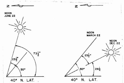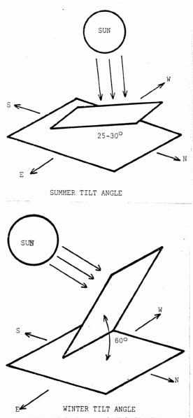 The greatest amount of solar energy will be received if the collector is faced to the south, due to the location of the sun in the sky. To receive the maximum amount of solar radiation upon a surface during an Indiana winter, it should be tilted at an angle of 55-60° from the horizontal. In summer, the maximum amount of solar radiation strikes the collector tilted at an angle of 25-30° from horizontal (Figure 9). If the surface does not face due south the greatest amount of collection will occur in either the morning or afternoon instead of at solar noon. This will decrease the daily total of collected energy.
