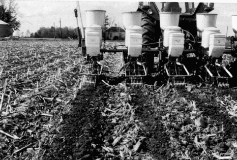 No-till as used in this bulletin refers to placing seeds in a slot or narrow tilled strip (2 in. or less). After corn or sod, the system leaves 70-95% surface cover which is very effective in controlling soil erosion. After soybeans, no-till planting usually leaves surface cover of 50-70%.