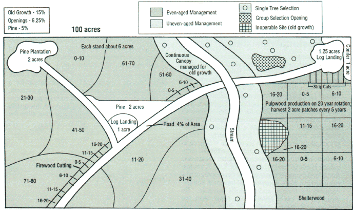 Generally, the management of 5- to 20-acre irregularly shaped timber stands, some of which are harvested every 10 years over an 80 to 100 year rotation, will result in a mixed timber stand of different ages. The well-dispersed stands of timber in early successional stages will benefit most forest wildlife species (Figure 3). Under the above recommendations, 40% of the timber in commercial production will favor pioneer wildlife species (eg. white-tailed deer, ruffed grouse, blue-winged warbler) by providing stands less than 40 years old on a 100 year rotation. On an 80 year rotation, 50% will be in this cover type.