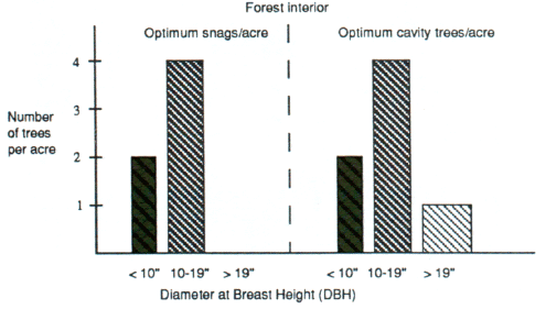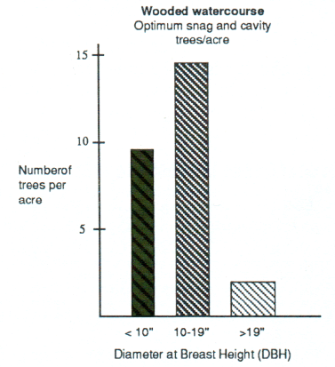 Approximately 90 wildlife species n the central hardwoods region depend on cavity trees and snags for food and shelter. In order to accommodate the needs of the widest variety of wildlife species, a mixture of cavity and snag trees of the proper sizes (Figures 1 and 2) should be left in each stand. For best results, these structures should occur in both openings and mature forests. The retention of snags has little effect on the growth of desirable trees. In fact, leaving these trees in the stand saves time and money often spent on removal. In addition, the insect eating bird and mammal species these snags attract play a role in controlling insect pests in your woods. In forest interiors, the retention of six snags and seven cavity trees per acre of the proper sizes is ideal. Wooded watercourses provide an important type of habitat to a more diverse set of species. Therefore, the optimum number of snags and cavity trees is higher-twenty-five snags and/or cavity trees per acre 1.