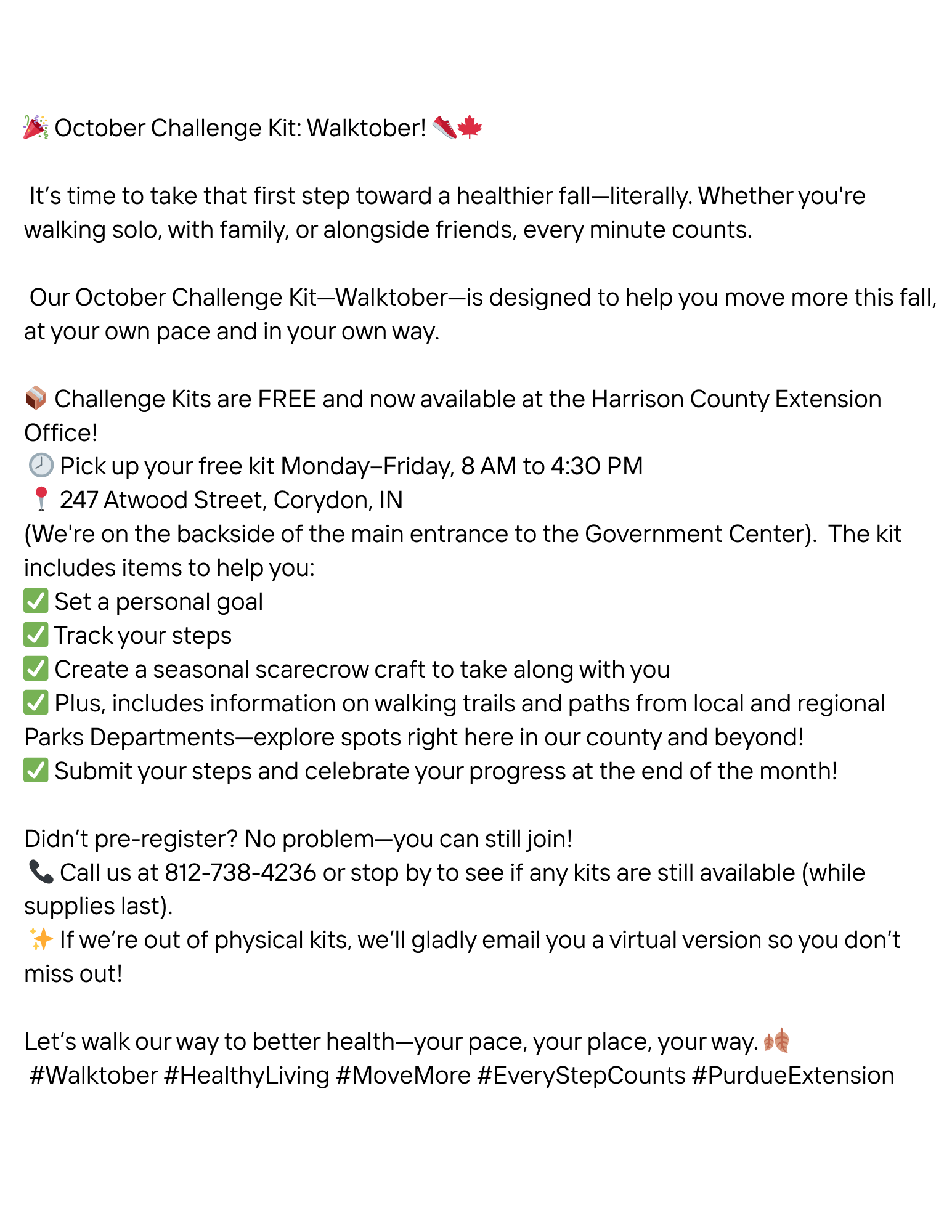 Our monthly challenge kits provide instructions and most materials to do a DIY educational project or two on your own. The kits are geared towards ALL Harrison County community members, and focus on Extension education areas.