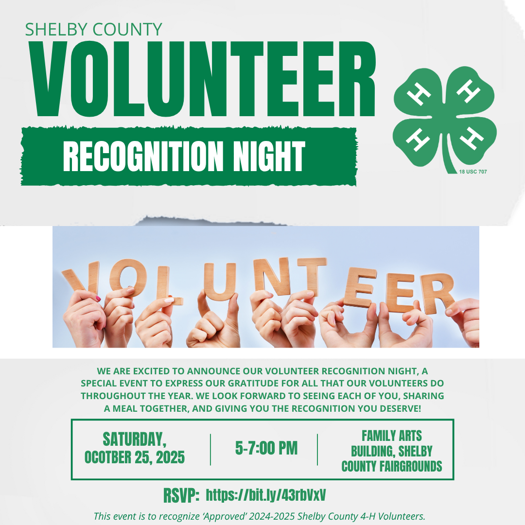 To better thank and recognize all that our volunteers do throughout the entire year, we will host a Volunteer Recognition Night. This event will take place on October 25, 2025, at the Family Arts Building on the Shelby County Fairgrounds. More information about this event will be shared soon! We look forward to seeing each of you, sharing a meal, and giving you the recognition, you deserve.