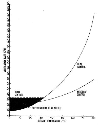 Many mechanical ventilation system manufacturers design fan capacities on the basis of odor control in winter rather than moisture control. Since this rate is higher, more supplemental heat is needed to insure a constant building temperature.