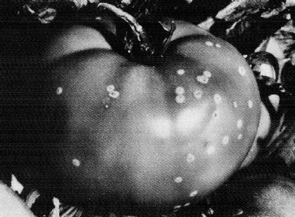 Bacterial canker is most easily recognized by the appearance of raised, white blisters (1/16-1/8 inches in diameter) on green or red fruit (Figure 1). The blisters are often referred to as "bird's eye" spots.