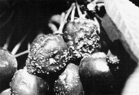 The first evidence of the rot is the appearance of a small circular brown spot that develops very rapidly if the fruit is mature. The rotted area eventually becomes covered with gray-colored tufts which break through the skin of the fruit. It is this stage that gives the disease the name "Brown Rot". The fruit usually retains its form and remains attached to the tree for some time after it is completely rotted; then it either falls or, if retained on the tree, gradually dries into a firm "mummy".