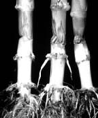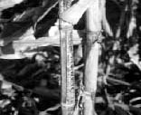 FIG. 3 Twisted and collapsed tissues on the lower internodes of stalks are characteristics of the rare Pythium stalk rot. | ||||||||||||