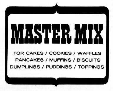 Making the Master Mix Using Lard or Oil in the Master Mix Adapting Recipes for Use with the Master Mix Biscuits Muffins Griddle Cakes or Waffles Coffee Cake Gingerbread Dumplings Corn Bread Yellow Cake Orange Raisin Cake Apple Cake Chocolate Cake Blackberry Roll Caramel Dumplings Apple Crisp Topping Donut Muffins Baked Chocolate Pudding Steamed Fruit Pudding Drop Cookies Molasses Cookies Peanut Butter Cookies Chocolate Drop Cookies Oatmeal Cookies You May Want to Try These