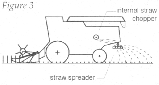Other straw choppers are mounted internally as on Case-IH combines in Figure 3. The straw chopper is actually the discharge beater drum with stationary knife sections attached. The chopped material is propelled toward the rear (as with the beater) to a deflector, then is dropped onto the straw spreader.