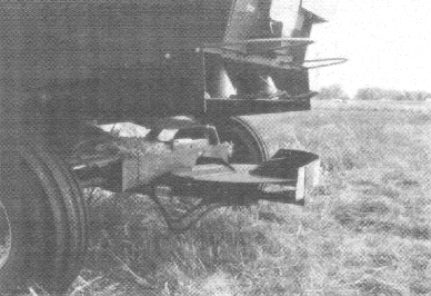 Some straw choppers are mounted externally, as shown in Figure 2. The straw chopper attachment replaces (or occupies the same space used for) the straw spreader attachment. The chopped material passes through deflector fins, which distribute it over a wider swath to the sides and behind the combine. The chopper unit can be slid or rolled forward without removal to accomplish windrowing.