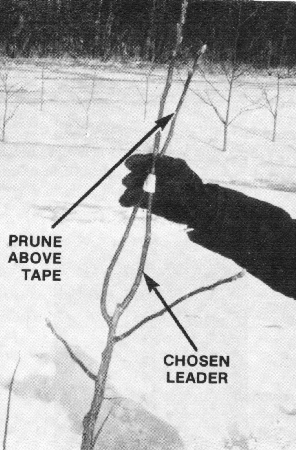 Taping is done with 3/4 inch wide masking tape with 5 to 7 wraps. Opposing branches are crossed so that the chosen leader is straightest (Figure 10).