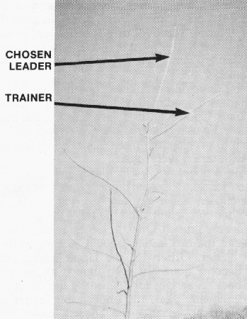 If you are fortunate enough to have a branch directly under the chosen leader, allow it to remain intact, since it will act as a trainer and force the chosen leader into an upright position (Figure 5). Remember the principle of tree balance.
