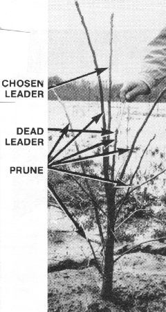 Occasionally the previous year's leader will die back producing a profusion of branches or multiple leaders (Figure 7). Again, all branches competing with the chosen leader should be removed (Figure 8).
