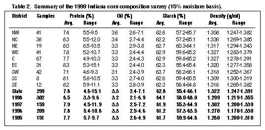 This fact sheet summarizes the composition data compiled for corn samples collected in Indiana during the 1999 harvest. District results are presented and composition data from the 1995, 1996, 1997, and 1998 crop years are compared.