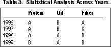 A statistical analysis was performed on the data collected from the last four years using Statistical Analysis Software (SAS) to uncover differences between years and between districts within a year. All tests used an alpha of 0.05. District summary values for 1996, 1997, and 1998 can be found in Grain Quality Fact Sheets 31, 36, and 41 respectively. The results of the analysis are summarized in Tables 3 and 4. In Table 3, the years are statistically similar if they have the same letter, while in Table 4, the districts with the same letter are similar within a year.