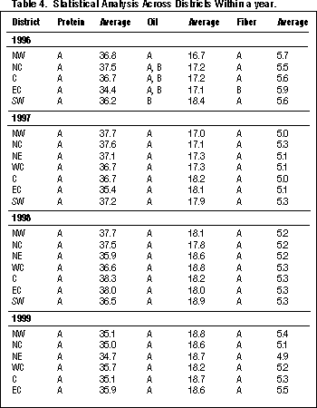 Oil content averages in 1996 and 1997 were significantly lower than the averages in 1998 and 1999 (Table 3). In 1997, 1998, and 1999, all districts were statistically similar in oil content, while in 1996 the NW district was significantly lower and the SW was higher compared to all other districts (Table 4). The SW district had the highest oil content average in 1996 (18.4%) and in 1998 (18.9%). The C district had the second highest average in 1996 with oil content values of 17.2% and 18.7% respectively, while having the highest average in 1997 (18.3%). The NW district had the highest average in 1999 (18.8%), however, the district had the lowest average in 1996 and 1997 with averages of 16.7% and 17.0% respectively. The NC district had the second lowest average in 1997 (17.1%) and the lowest average in 1998 with 17.8% average. The EC district had the second lowest oil average in 1996 and 1998 with averages of 17.2% and 18.0%, respectively while the WC district had the lowest oil content (18.2%) in 1999.