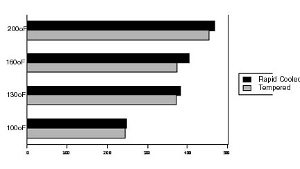 kernel deep from approximately 20% w.b. moisture to 14% w.b. moisture. Drying tests were performed at 100°F, 130°F, 160°F and 200°F. After drying, samples were subjected to either rapid cooling to 40°F or tempering for one hour before being allowed to cool to room temperature. Figure 2 shows the combined results of each drying treatment. From this figure, it is clear that as the kernel temperature increased during drying, the level of stress crack damage increased as well. Between 100°F and 130°F there was a large step increase in the amount of stress crack damage that occurred. In other words, once kernel temperatures exceed 100-110°F, stress crack damage was so severe that increasing the temperature from 130°F to 160°F or 200°F did not make a significant difference. Thus, in order to minimize the amount of stress cracking damage, kernel temperatures should be kept below 100-110°F. Dryer operators must realize that the kernel temperature is not the same as the drying air temperature. The drying air temperature is the temperature set at the burner. The maximum kernel temperature is the highest allowable temperature the kernels should reach during the drying process. The less heat and the slower the drying (and cooling) process, the higher the final white corn quality will be. | ||||||||||