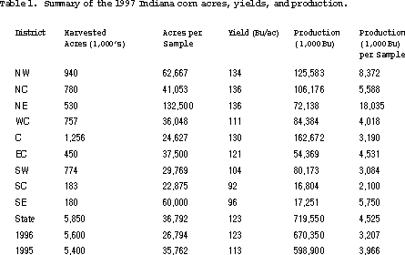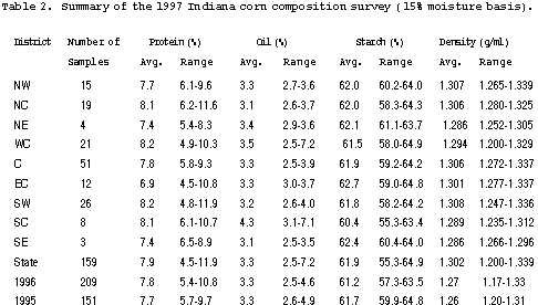 spread was not as wide when compared to the 1996 data. Overall, the composition data for the 1997 Indiana corn crop again reflected the variability in growing conditions experienced by farmers across the state last year. The results in Table 2 only give an indication of the composition values of corn across Indiana. Conditions during the growing season, hybrid selection, and soil fertility significantly affect intrinsic values such as protein, oil, starch, and density. Producers need to have their own samples analyzed to get more precise values. Purdue University's Grain Quality Laboratory continues to offer composition analysis for whole corn, soybeans, and soybean meal. This service is offered at no charge to Indiana producers, elevators, and processors thanks to a Value-Added Grant from the office of Indiana's Commissioner of Agriculture. 450 g (about 1 lb.) may be sent to Grain Quality Laboratory | |||||
