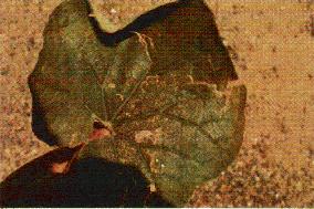 The injury on the watermelon leaves consists of premature chlorosis (yellowing) of the upper surface of the older foliage (Figure 2). The foliage later becomes necrotic (brown or black) (Figure 3), with white spotty patches within the necrotic areas (Figure 4). Ozone injury on muskmelon is similar, except that foliar discoloration on the upper areas goes directly from yellow (Figure 5) to bleached white (Figure 6).