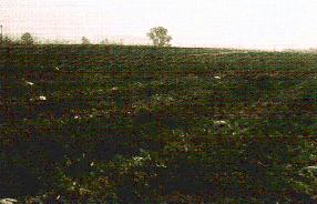 The injury pattern on the foliage is initially observed on older mature leaves near the crown or center of the plant, often progressing with time to the younger, more vigorous foliage. The yellowing of the plant centers in rows of watermelons is quite distinct and can give fields a visibly striped pattern of alternating yellow and green bands (Figure 7). In other states, this type of injury on watermelon has been descriptively referred to as "center of the crown dieback." In contrast, injury on muskmelons is typically much less severe and is visible at a later stage of plant development. Air pollution-induced injury on watermelons and muskmelons has been experimentally verified in the laboratory.