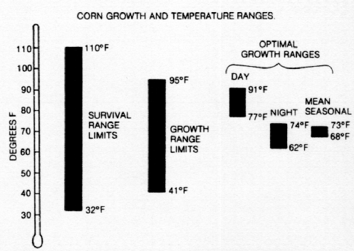 Corn can survive brief exposures to adverse temperatures, such as temperatures ranging from near 32 F (0 C) to over 112 F (45 C). The growth limits are somewhat less, with beginning temperatures of near 41 F (5 F ) climbing to near 95 F (35 C). Optimal temperatures for growth vary between day and night, as well as over the entire growing season; for example, during daylight hours, the optimal ranges between 77 F and 91 F (25-33 C) while night temperatures range between 62 F and 74 F (17-23 C). However, the optimal average temperatures for the entire crop growing season ranges between 68 F to 73 F (20-22 C). These relationships are illustrated in Figure 1.