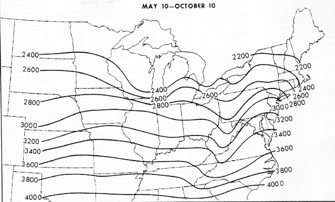 The mean GDD values for the Corn Belt and adjacent regions are illustrated in Figure 3. Over a five-month period of May 10 to October 10, the northern boundary of corn grown for grain receives an average of 2400 GDD. The southern boundary receives an average of 3600 GDD. The GDD values in Figure 3 are compiled by the "cut-off" method.