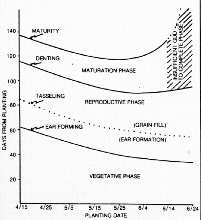 For example, as may be seen in Figure 5, corn planted on April 15 takes 136 days to accumulate 2700 GDD. Almost half of this time, 62 days, is in the vegetative stage. The corn is expected to tassel in 84 days, begin denting in 115 days, and because of warm temperature, require 136-115 = 21 days for grain maturation. A planting in mid-May is expected to accumulate 2700 GDD and be mature in 119 days. Because of warmer temperature at planting, the corn would be in the vegetative phase for 44 days. It would begin to dent 96 days after planting and would require 119-96 = 23 days for grain maturation. With still warmer temperatures at planting, corn planted on June 14 would be in the vegetative stage only 36 days. The grain would begin denting 91 days after planting. However, delays in planting shift maturation into the cooler part of autumn so that it takes a longer time to accumulate the necessary GDD for this phase of the cycle. The June 14 planting is expected to take 44 days for maturation. This increases the total time to maturity to 135 days. A June 24 planting would have sufficient GDD for the vegetative and reproductive phases, but unless the growing season is warmer than normal, would not accumulate sufficient GDD to complete the maturation phase.