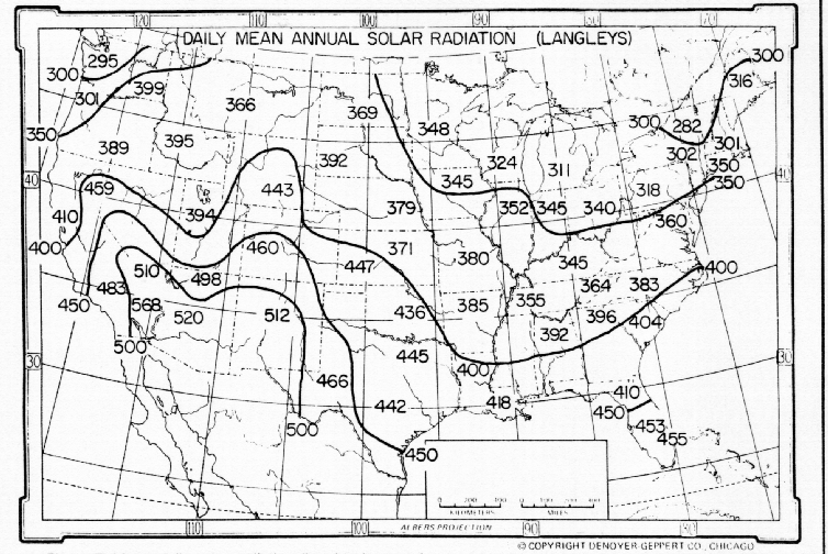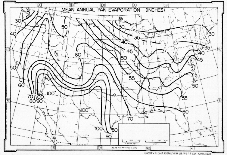 The average annual solar radiation varies from about 300 langleys (gram calories per centimeter squared per minute) in the Northeast to over 500 langleys in the Southwest desert areas, as illustrated in Figure 7. The average for the Corn Belt ranges from 330 to 360 langleys. This figure is the energy that evaporates water from ponds and lakes, from the soil, and through plants. The annual evaporation measured from the network of pans, by the National Weather Service, relates rather closely to the average annual solar radiation values, see Figure 8. In the Northeast, pan evaporation averages less than 40 inches (100 cms), while in the Southwest, an average of over 100 inches (250 cms) of water may be evaporated each year.