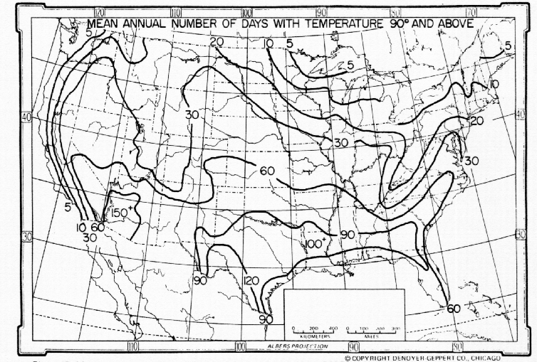 Another measure of potential negative crop water balance is related to average number of days with temperatures above 90 F (32 C) during the corn growing season. Figure 9 illustrates the average annual number of days with temperatures of 90 F and above. The western and southern areas of the United States average between 30 and 60 such days, while the northern and eastern portions average less than 20 days per year. Significant reductions in corn yields may occur in years when hot spells coincide with the critical ear formation, reproduction, and grainfill period.