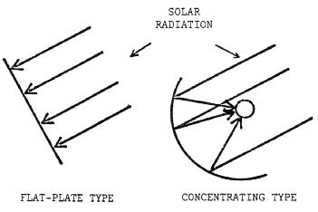 There are two basic types of solar energy collectors used for the heating of air or water. They are the flat-plate type collector and the concentrating collector. (Figure 1). The concentrating collector focuses the direct rays of the sun which are incident on a reflector onto a smaller absorbing area, The flat plate collector involves no focusing of the radiation. It absorbs the direct rays and also is capable of absorbing diffuse radiation -- that is, the portion of the suns' energy which is filtered through clouds or is reflected from other objects. Because of the focusing effect, a concentrating collector can heat an absorber to a much higher temperature than can a flat plate collector. But, because of the use of only direct rays, the concentrating collector must continually "track" or "follow" the sun across the sky. The flat plate collector may remain stationary since it does not require direct radiation to operate.