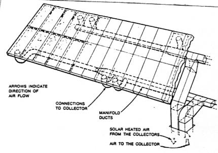 The two fluids most commonly used for absorbing and transferring the heat are air and water. An air collector can be as simple as a bare sheet of metal (as a metal roof), painted a dull black to absorb the most possible energy, with air blown underneath in a duct of some type as in Figure 2a.