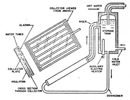 The basic water collector consists of an absorber plate, generally having water tubes attached, a cover, and insulation behind the absorber plate, as in Figure 3. Heat from the absorber plate is re-moved by the water circulating in the tubes.